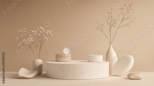 elegant, minimalist, composition, ceramic, vase, pedestal, beige, background, showcase, natural, soap, tube, neutral, brand, grace, modern, plant, zen, skincare, soft, decor, display, calm, product, design, stage, scene, footprint, spa, clean, dais, home, lifestyle, art, pumice, style, setup, mute, wellness, set