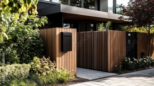 A chic, integrated parcel delivery box within a wooden fence, blending naturally with the houses modern design while offering practical delivery storage