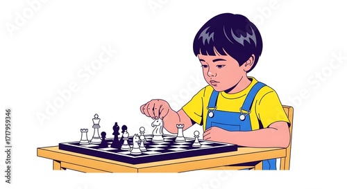 A child engrossed in a game of chess, strategically moving pieces on a checkered board.