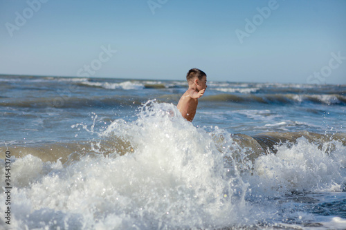 beach, sea, boy, water, ocean, fun, wave, summer, children, young, blue, surf, happy, vacation, wave, coast, children, sky, sand, active, joy, beautiful, holiday, people