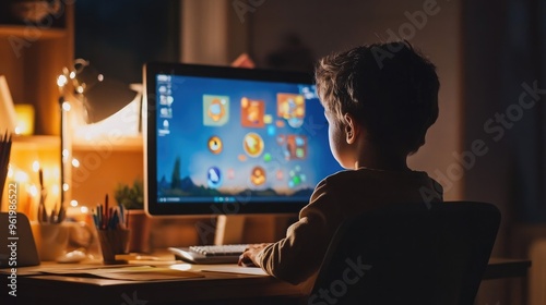 A child sitting at a computer, participating in an online learning game, with educational graphics on the screen