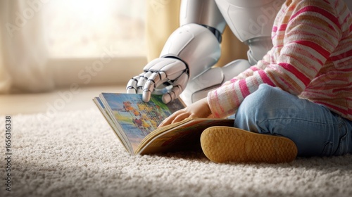 A child sitting cross legged on the carpet reading a colorful book, with a robot gently holding the other side of the book, warm daylight