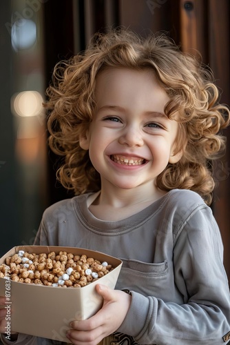 children, smile, brightly, hold, box, cereal, symbolize, overall, happiness, present, joyful, fill, fun, sweet, light, flash, eye, mood, surprise, breakfast, healthy, vibrant, package, face
