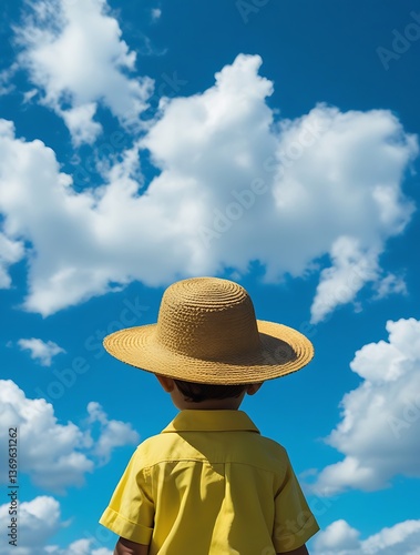 A child wearing a wide-brimmed straw hat and a yellow shirt gazing at the bright blue sky with fluffy white clouds, evoking a sense of wonder, freedom, and summer joy