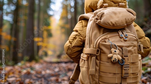 A child’s backpack with a small ring-tidy bear plush dangling from its zipper pull.
