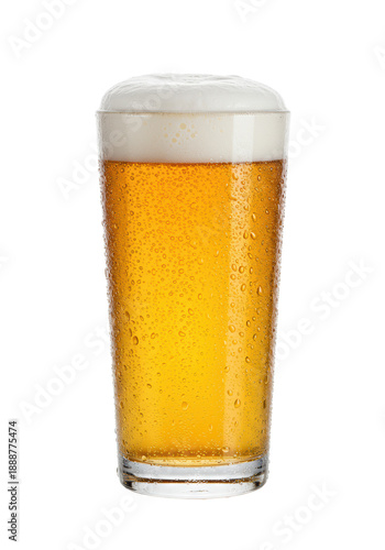 A chilled nonic pint glass of golden-amber beer, glistening with condensation and topped with thick white foam, isolated on a reflective white studio background with copy space. Refreshing beverage