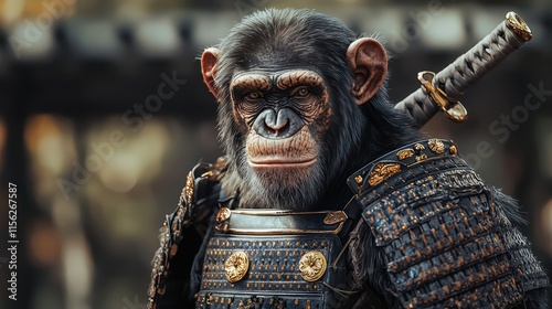 chimpanzee, samurai, armoring, monkey, ape, warrior, japan, culture, tradition, costume, animal, portrait, mammal, primate, wildlife, powerful, strong, stoic, intense, magnificent, impressive, dark, gold, black, serious, ancient, history, mythical, legendary, fearsome, majestic, noble, elegant, photographic, art, image, visual, graphic, studio