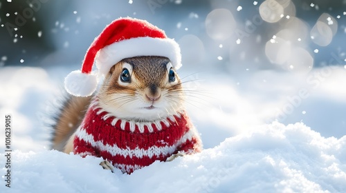 A Chipmunk Dressed in a Red Santa Hat and Sweater in the Snow