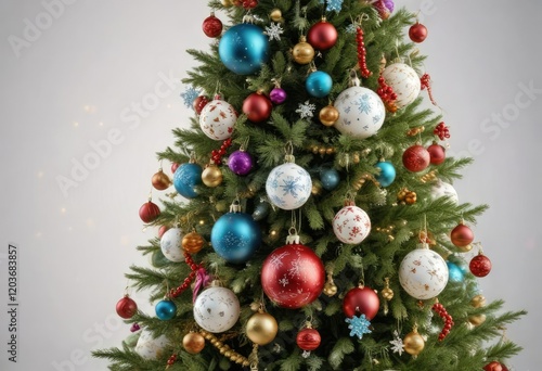 A Christmas tree adorned with snowflakes, bells, and colorful ornaments against a white background, bell ornaments, colorful garlands