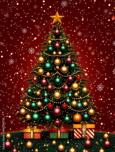 christmas, tree, decorated, winter, seasonal, celebration, red, christmas, snow, illustration, christmas tree, pine, background, festive, ornament, colourful, card, star, shiny, bright, holiday, light, green, gift, december, garland, present, blue, glistering, design, traditional, fir, vertical, gold, ornate, eve, gold, beautiful, space, bauble, ball, glowing, illuminated, banner, wrapped, snowy, new, nature, pine tree