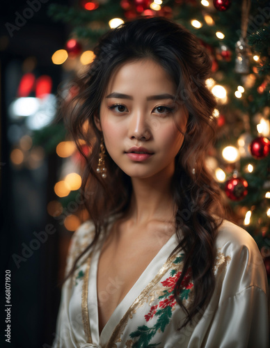 A Christmas-inspired close-up of an Asian beauty, showcasing her exquisite Oriental allure. Generated Ai
