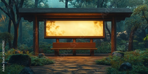 bus, stop, bench, forest, nature, travel, mystery, fantasy, advertisement, billboard, banner, advertisement, commercial, marketing, campaign, signs, message, notice, information, display, station, transportation, journey, destination, path, road, wilderness, environment, landscape, scene, background, mood, atmosphere, shadow, light, glow, illumination, night, dusk, evening, silence, calmness, solitude, park, garden, escape, adventure, exploration