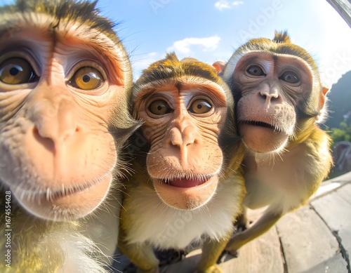 realistic, cinematic, photorealistic, fisheye, selfie, monkey, three, primate, animal, mammal, detailed, portrait, closeup, dynamic, dramatic, expression, eye, fur, coat, texture, fisheye, distortion, panoramic, outdoors, nature, wildlife, safari, jungle, natural light, sunlight, shadow, wild, group, troop, friendship, bond