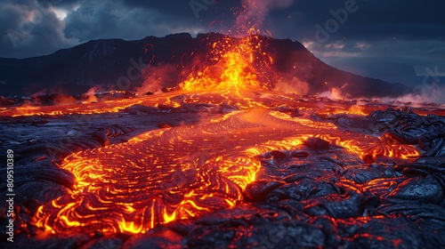 cinematic, volcanic, eruption, night, lava, red, orange, dramatic, mesmerizing, spectacle, contrast, dark, bright, flow, high-coloured, lighting, fiery, molten, intense, natural, disaster, geology, magma, glow, heat, ash, smoke, explosive, danger, powerful, environment, nature, force, radiant, shimmering
