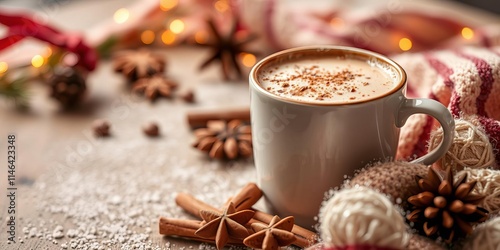 A cinnamon latte with frothy milk in a cozy holiday setting, topped with ground spices for a warm and inviting atmosphere, cozy, relaxation