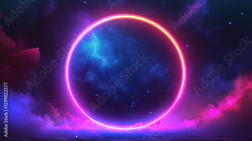 A circular neon light frame illuminated by twinkling stars in a mesmerizing display