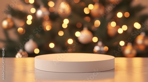 A circular platform sits in the foreground, inviting attention, while a beautifully decorated Christmas tree glimmers with warm lights in the background, creating a festive atmosphere.