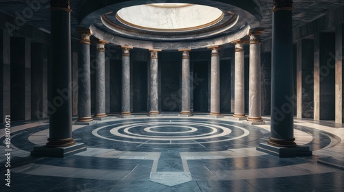 background, roman, greek, ancient, stage, interior, room, black, pillar, architecture, display, racked, roma, scene, fight, circular, marble, floor, column, skylight, light, illumination, grandeur, mystery, classic, ornate, pattern, geometric, design, space, empty, hall, temple, dome, ceiling, shadow, contrast, dark, stone, polished, texture, smooth, symmetric, elegant, sophisticated, majestic, timeless, power