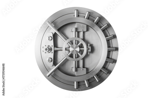A circular stainless steel bank vault door with a complex locking mechanism. background removed