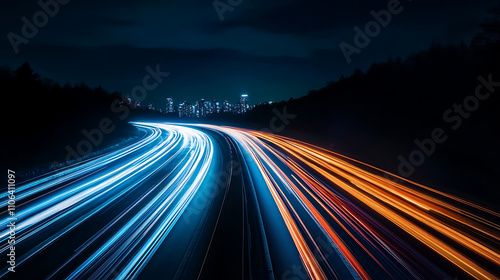 A city skyline at night with light trails from cars driving on the highway creating dynamic lines of motion and energy