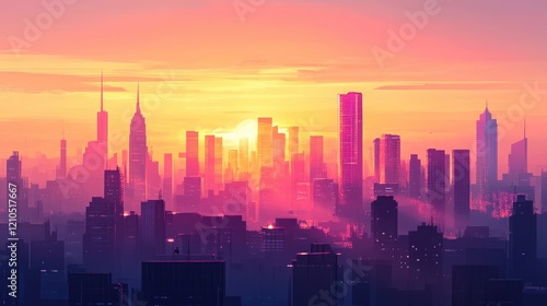 A city skyline at sunrise, with the first rays of light striking the tops of skyscrapers and casting a warm glow over the bustling urban landscape.