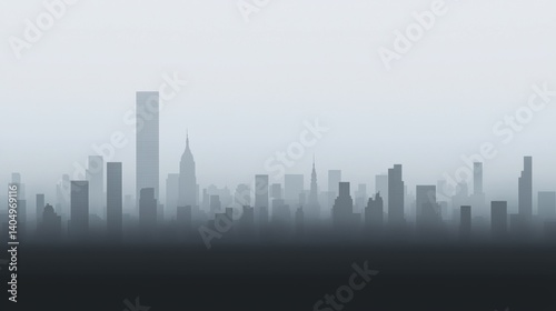 A cityscape silhouette against a foggy sky.