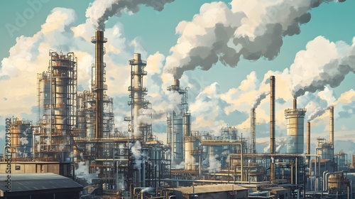 A cityscape with a large industrial plant in the middle. The plant is surrounded by trees and buildings. The sky is hazy and the air is thick with smoke. Concept of pollution and industrialization