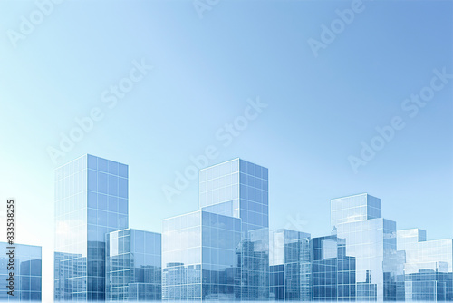 A cityscape with transparent buildings against a clear blue sky, conveying modern, clean architectural design