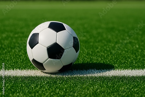 A classic black and white soccer ball rests poised on the vibrant green grass field with white line.