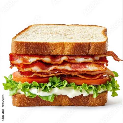 classic, sandwich, crispy, bacon, lettuce, tomatoes, mayo, toasted, whole, wheat, bread, isolated, white, background, realistic, art, style, flat, photo, front, view, focusing, stacked, layer, fresh, vegetable, resolution, additional, side, condiment