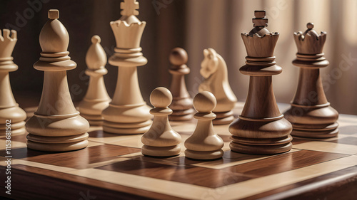 A classic chessboard in mid-game, set on a wooden table with earthy tones. The creamy chess pieces contrast with the dark squares, evoking a thoughtful and strategic atmosphere in a quiet study.