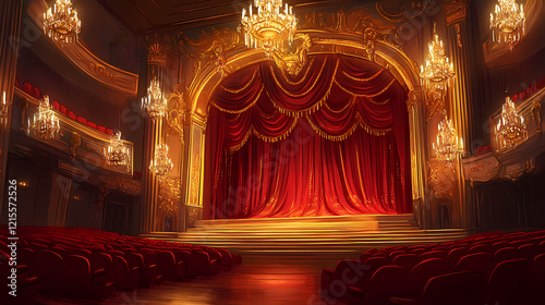 A classic european opera house with grand chandeliers, red velvet seats, and gilded detail. Gilded Arch. Illustration