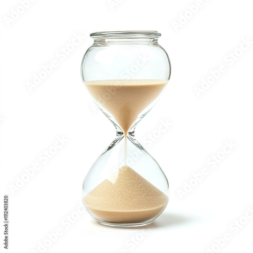 A classic hourglass filled with sand marking the passage of time isolated on white background.
