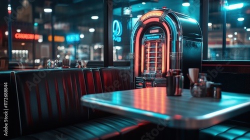 A classic jukebox glowing in neon lights inside a retro-themed diner