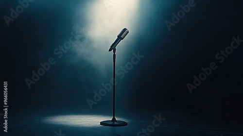 A classic microphone stand illuminated on a concert stage, ready for a powerful vocal performance, with dramatic lighting against a black background