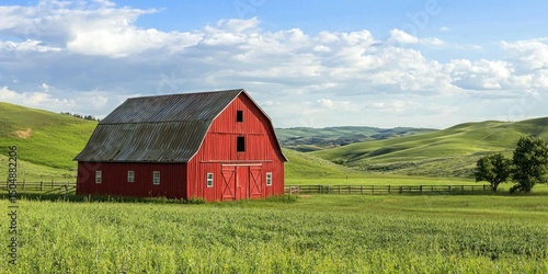 A classic red barn standing in a vast green pasture, with rolling hills in the background