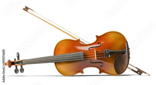 A classic wooden violin with a bow resting on a white background brown musical instrument