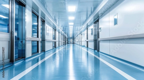A clean, empty hospital hallway with blue and white walls, white doors, and a glass door on the right.