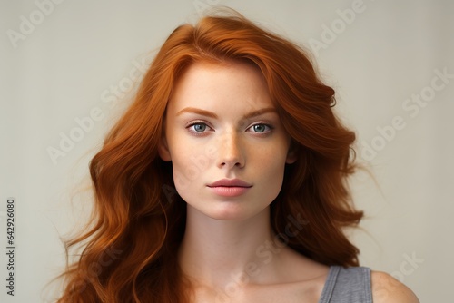 a clean studio portrait of a gorgeous young caucasian woman with red hair looking into the camera smiling, grey beige colored background