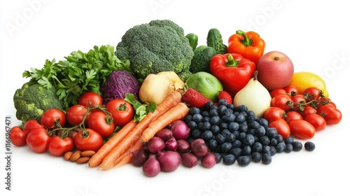 A clean white background with a paper bag overflowing with healthy fruits, vegetables, and nuts, with space for a text banner promoting a balanced diet.