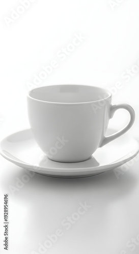 A clean white ceramic coffee cup and saucer set elegantly displayed on a bright white reflective surface, symbolizing simplicity and morning rituals.