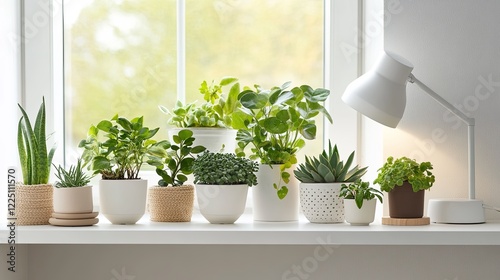 A clean white shelf adorned with small indoor plants and a minimalist table lamp. digital