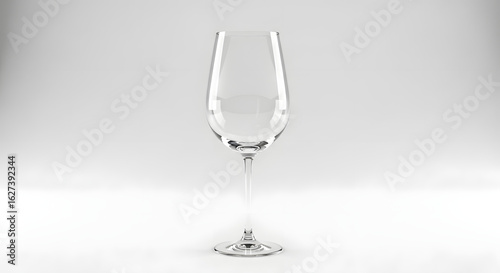 A clear, empty wine glass stands centered against a bright, neutral background, showcasing its elegant shape and transparency.