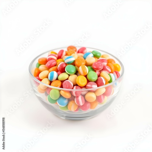 A clear glass bowl overflowing with a vibrant mix of small, colorful candies, including striped and solid varieties, set against a bright white background.