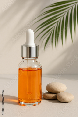 A clear glass dropper bottle of orange serum, resting on a light beige surface, with smooth stones and a palm leaf in the background.