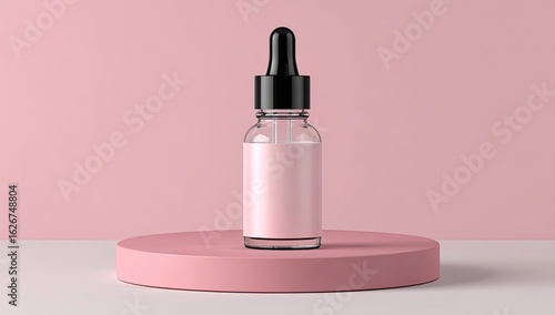 A clear glass dropper bottle with a light pink label sits on a small, round, pink pedestal against a soft pink background