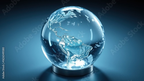 globe, glasses, america, north, south, continent, earth, earth, sphere, clear, blue, dark, background, water, ocean, geography, global, transparent, surface, shiny, round, shape, structure, design, art, artistic, element, still life, studio, shot, closeup, detail, illuminated, light, glow, modern, concept, creative, showing