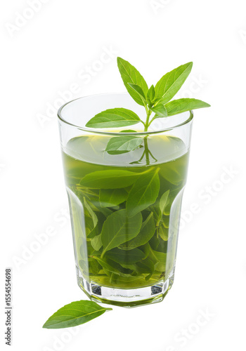 A clear glass holds liquid with vibrant green plant leaves, some floating at the top