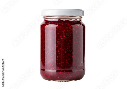 A clear glass jar filled with vibrant red berry jam, showcasing its glossy texture and the embedded fruit pieces against a plain black background.