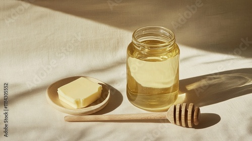 A clear glass jar of honey with a wooden dipper beside a small dish of butter on a neutral surface